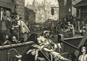 El grabado cuenta la historia de una mujer medio borracha y desnuda que no se da cuenta de que su hijo está a punto de caer a su muerte, mientras que un esqueleto cantante representa la muerte. El punto principal es que hay un caos y todos, desde bebés hasta ancianos, están bebiendo ginebra.